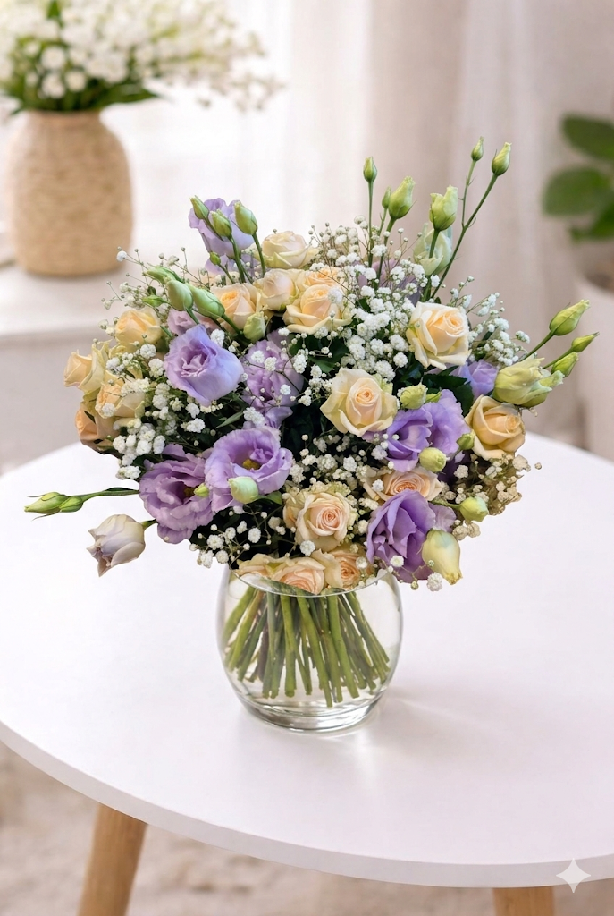 Lummav kimp kreemide rooside ja lavendlililla preeria kellaga. Õrnust lisab kipslill.