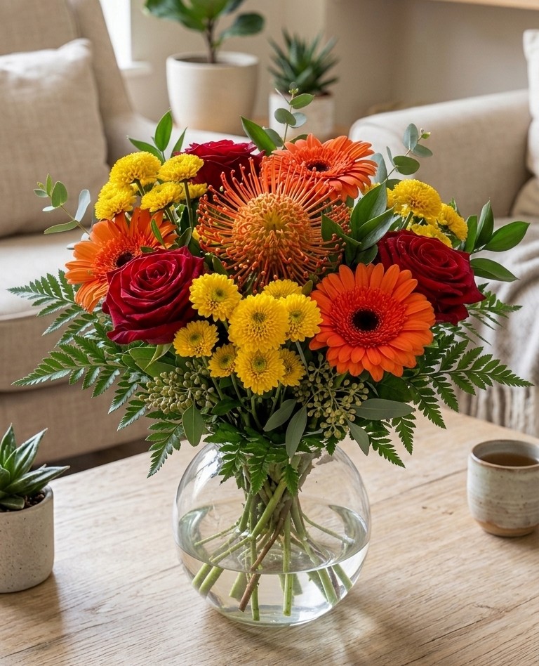 See pilkupüüdev kimp rooside, gerberate ja krüsanteemidega on särtsaks ja võluv. Erilisust lisab aktsendina põnev prodea.